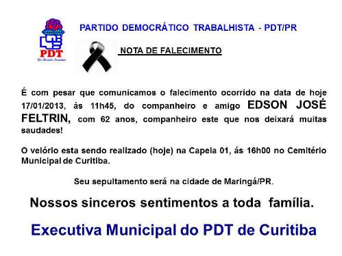 PDT lamenta morte de Feltrin 17/01/2013 Compartilhe isso: Clique para compartilhar no Facebook(abre em nova janela) Facebook Clique para compartilhar no X(abre em nova janela) 18+ Clique para compartilhar no WhatsApp(abre em nova janela) WhatsApp Relacionado