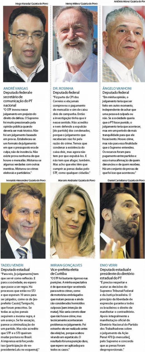 Ora, ora! Sem ter muito o que dizer… dizem, os entrevistados, despautérios impensados. (ANDRÉ VARGAS) NÃO EXISTE PROVA DO MENSALÃO… O pior cego é aquele que não quer ver… e o pior algoz é aquele que tenta cegar a messe. (DR ROSINHA)… NEM COMENTO… Parabéns TADEU VENERI …ÚNICO COERENTE. (MIRIAN GONÇALVES) ANTES DAS ELEIÇÕES… Se temos no Brasil, eleições bienais, em qualquer época que se fizesse acabaria antes de uma eleição. (ENIO VERRI)Para crimes com participações desproporcionais, claro PENAS DESPROPORCIONAIS. Percebe-se nessa amostragem de entrevistas que o discurso é predominantemente, como sempre, apaixonado e só apaixonado, sem coerência de pensamentos e sem muito o que dizer em defesa dos condenados… PREFEREM CONDENAR AO STF! Se desejam continuar no processo democrático, que repensem a voracidade e a ganância e façam uma reengenharia do partido.