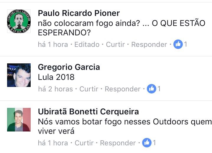fogoPetistas e lulistas de várias cataduras estão convocando a militância para tocar fogo nos outdoors que ‘homenageiam’ Lula com a frase: “Lula, Curitiba te espera de grades abertas” com a desenho estilizado do petista em trajes de presidiário.