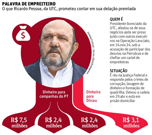 O empresário Ricardo Pessoa, dono da empreiteira UTC, disse a procuradores da Operação Lava Jato que doou R$ 7,5 milhões à campanha à reeleição da presidente Dilma Rousseff por temer prejuízos em seus negócios na Petrobras se não ajudasse o PT.