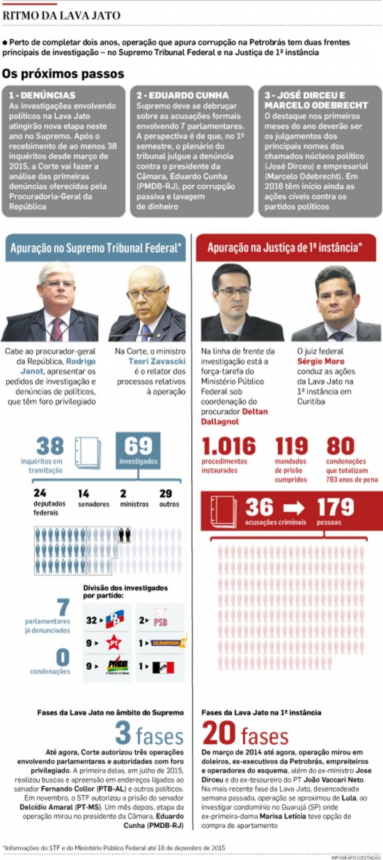 Com duas frentes principais de investigação, a Lava Jato vai avançar este ano nos inquéritos e processos envolvendo políticos. Até o momento, quase dois anos depois de deflagrada, a operação se caracteriza por um ritmo mais acelerado na 1.ª instância, comandada pelo juiz Sérgio Moro. A expectativa, porém, é de que em 2016 as apurações atinjam uma nova etapa no Supremo Tribunal Federal. Após o recebimento de ao menos 38 inquéritos desde março de 2015, o tribunal vai fazer a análise das primeiras denúncias oferecidas pela Procuradoria­-Geral da República como desdobramento das apurações. as informações são de Beatriz Bula e Ricardo Brandt no Estadão.