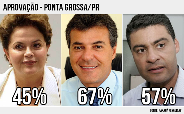 Levantamento do Paraná Pesquisas em Ponta Grossa, divulgado ontem, aponta o governador Beto Richa com 67,4% de aprovação, o prefeito Marcelo Rangel com 57,2% e a presidente Dilma Rousseff, com 45,7%. O instituto entrevistou 645 eleitores entre os dias 23 e 27 de junho – a margem de erro é de 4%.