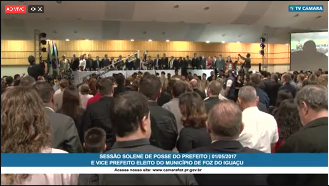Acontece neste momento, no Hotel Golden Park Internacional, a posse oficial do prefeito eleito de Foz do Iguaçu, Chico Brasileiro (PSD), e do vice-prefeito, Nilton Bobato (PC do B). A cerimônia, transmitida ao vivo no facebook da Câmara de Vereadores, reúne autoridades políticas, lideranças comunitárias e representantes da sociedade. O ministro da Ciência, Tecnologia, Inovações e Comunicações, Gilberto Kassab, a vice-governadora do Paraná, Cida Borghetti, o secretário de Desenvolvimento Urbano, Ratinho Junior, entre outras autoridades, prestigiam a solenidade. O evento recebe cerca de mil pessoal e a organização envolve em torno de 80 profissionais.