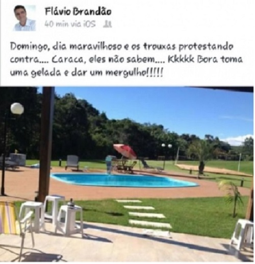 Os comentários de Flávio Brandão (PT), prefeito de Iguatu – a 70 quilômetros de Cascavel, vêm causando revolta nas redes sociais. Na tarde de domingo, 15, Brandão colocou a imagem de uma piscina e criticou as pessoas que foram às ruas durante as manifestações. “Domingo dia maravilhoso e os trouxas protestando contra… Caraca, eles não sabem….kkkkk bora toma uma gelada e dar um mergulho!!!!” , escreveu o prefeito. As informações são da CATVE. Brandão é professor do ensino médio e foi eleito em 2012 com 879 votos. Logo após a postagem vários internautas criticaram o prefeito.