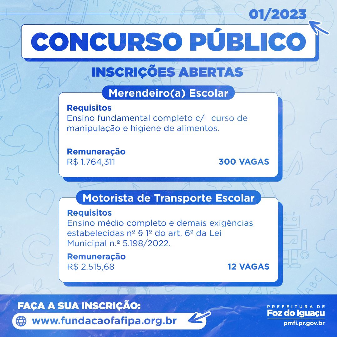 A Prefeitura de Foz do Iguaçu abriu um concurso público para contratação de merendeiro(a) escolar e motorista do transporte escolar. O edital foi publicado nesta terça-feira (12) no Diário Oficial do Município e também está disponível no site da Fundação Fafipa: https://www.fundacaofafipa.org.br/informacoes/3903/.