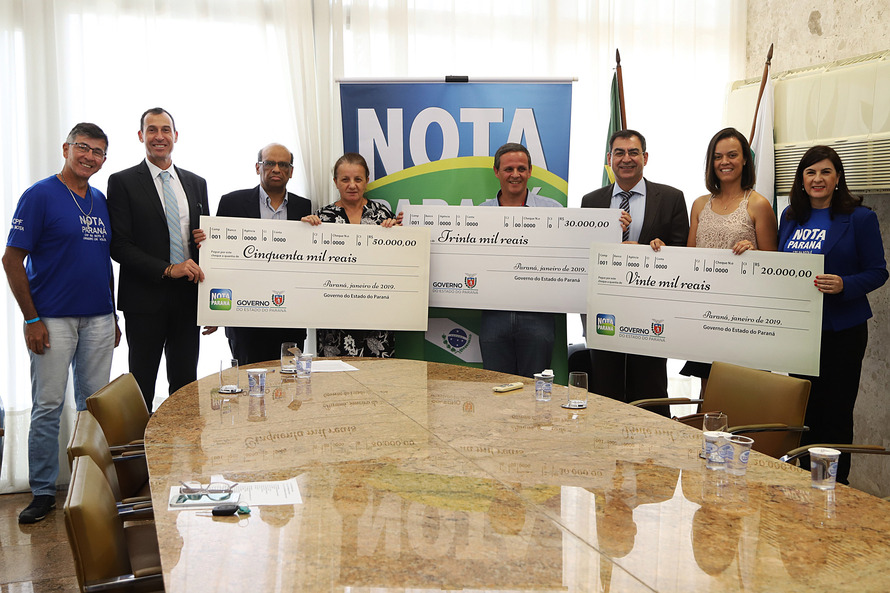 O Governo do Estado entregou nesta segunda-feira (21) os três principais prêmios do 38º sorteio do Nota Paraná, que aconteceu em 10 de janeiro. Uma moradora de Londrina, uma instituição, também de Londrina, e uma contribuinte de Colombo, na Região Metropolitana de Curitiba, foram as ganhadoras dos prêmios de R$ 50 mil, R$ 30 mil e R$ 20 mil, respectivamente. A entrega foi feita pelo secretário de Estado da Fazenda, Renê Garcia Júnior.