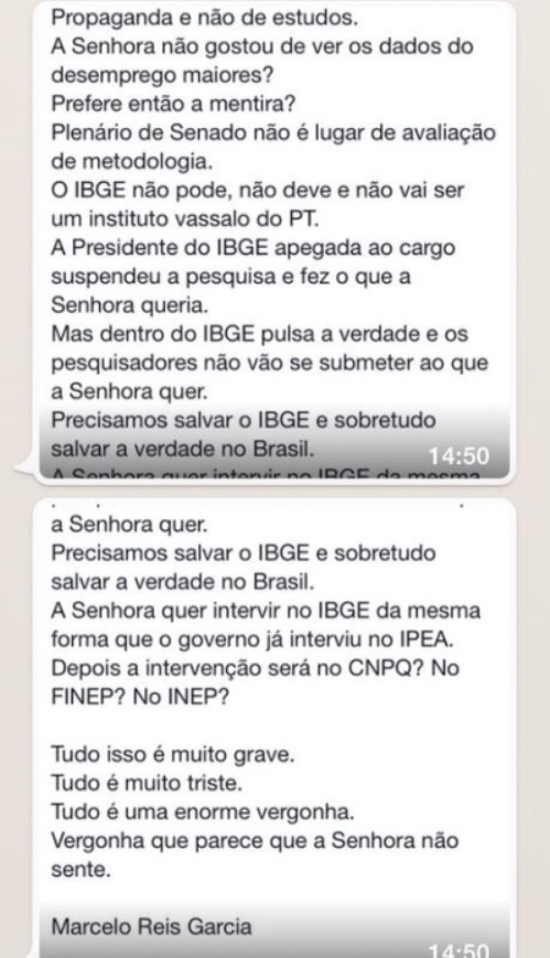 “A senhora não gostou de ver os dados do desemprego maiores? Prefere então a mentira? O IBGE não pode, não deve e não vai ser um instituto vassalo do PT. A presidente do IBGE apegada ao cargo suspendeu a pesquisa e fez o que a senhora queria. Mas dentro do IBGE pulsa a verdade e os pesquisadores não vão se submeter ao que a Senhora quer. Precisamos salvar o IBGE e sobretudo salvar a verdade no Brasil. A Senhora quer intervir no IBGE da mesma forma que o governo já interviu no IPEA. Depois a intervenção será no CNPQ? No FINEP? No INEP?”, questiona o professor