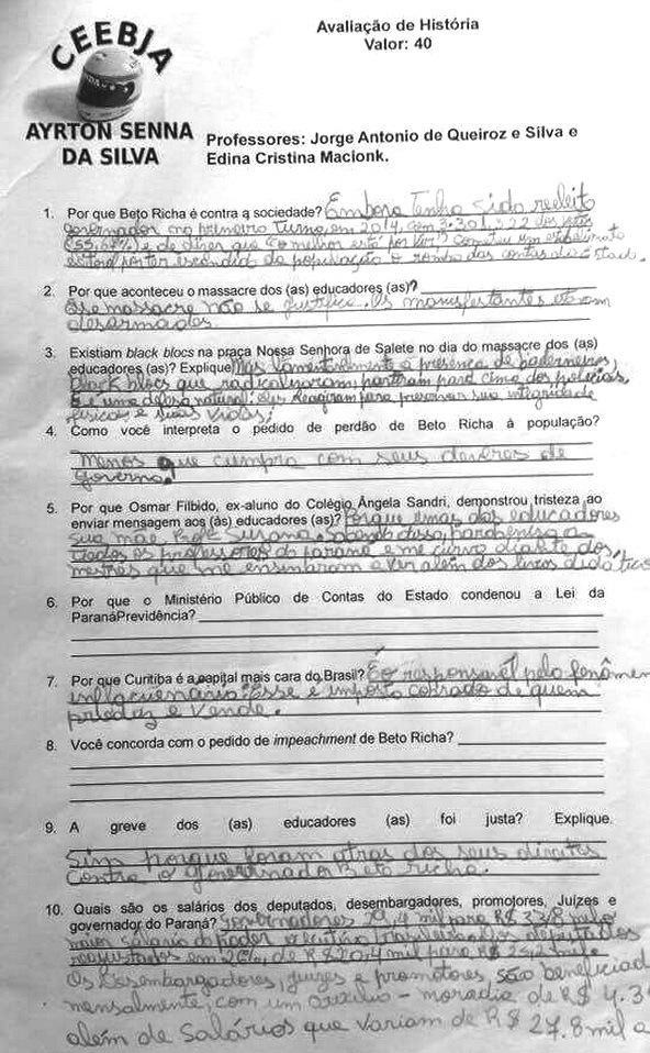 Os professores Jorge Antonio de Queiroz e Silva e Edina Cristina Macionk, do Colégio Estadual Ayrton Senna da Silva, de Almirante Tamandaré, confundiram liberdade de expressão com alopração. Submeteram alunos jovens e adultos a uma avaliação de história sobre os 73 dias de greve da categoria a que pertencem e cujas questões demonstram claramente o que pretendiam: “Por que Beto Richa é contra a sociedade?” Outra:”Por que aconteceu o massacre dos (as) educadores (as)?” Mais: “Como você interpreta o pedido de perdão de Beto Richa à população?” E: “Existiam black blocs na praça Nossa Senhora de Salete no dia do massacre dos (as) educadores (as)?” A revelação feita pelo repórter Antonio Senkovski, do jornal Gazeta do Povo, mostra que o aparelhamento político/ideológico do sindicato dos professores invadiu as salas de aula de uma forma tão absurda quanto seria a aplicação do mesmo “teste” com questões sobre o jogo de interesses da categoria que acabou com o primeiro semestre das aulas ou sobre a invasão ocorrida na Assembleia Legislativa em fevereiro e coisas do gênero, por exemplo. Professores são pagos para dar aulas e não catequizar alunos como foram catequizados. Na democracia o direito de escolha política, sexual ou coisa que o valha é livre e há fóruns adequados para se expor isso. “Temos autonomia na sala de aula. Estou contente com a repercussão, é sinal de que estamos incomodando. Minha consciência é livre”, justificou o professor Queiroz. Balela! Deveria se preocupar com a consciência de seus alunos que, assim como toda a sociedade, tem autonomia para criticar ou não o ocorrido, seja pelo lado do governo, seja pelo lado dos professores. Mas isso fora da sala de aula – e não através de manipulação panfletária de uma avaliação produzida por aprendizes de militância.