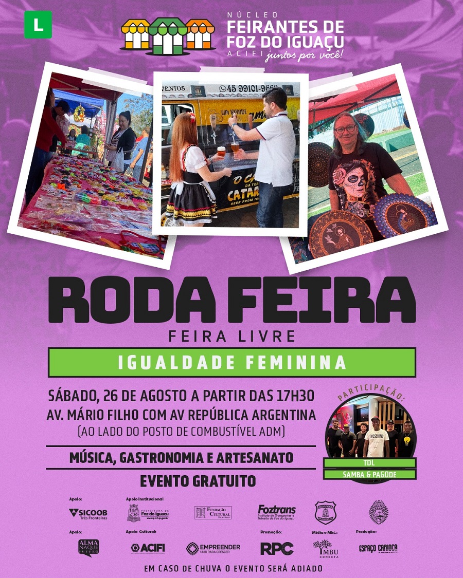“Roda Feira” realiza atividades culturais com apresentações artísticas que vão de shows musicais à dança, gera emprego e renda, amplia possibilidades de arrecadação de micro empresários e empreendedores individuais, fortalece iniciativas gratuitas para toda população, e promete circular por diversos bairros da cidade. A iniciativa é realizada Núcleo dos Feirantes de Foz do Iguaçu – ACIFI, e também conta com o apoio da Prefeitura de Foz do Iguaçu e a Fundação Cultural.