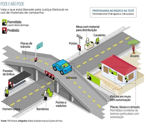 A partir deste domingo, está oficialmente permitida a propaganda eleitoral de candidatos que vão concorrer nas eleições de outubro. As regras são exatamente as mesmas do pleito municipal de 2012. Isso porque recentemente o Tribunal Superior Eleitoral (TSE) decidiu que a minirreforma eleitoral, que impõe uma série de restrições na tentativa de reduzir os custos das campanhas, só terá validade a partir de 2016. Pelas regras atuais, por exemplo, os comícios estão liberados entre 8 horas e meia-noite. No entanto, a apresentação de artistas cujo objetivo seja “animar” o evento está proibida. Também está proibida a distribuição de brindes pelos candidatos e a propaganda política em outdoors e bens públicos como postes, viadutos e pontos de ônibus. Por outro lado, é permitida, entre 6 horas e 22 horas, a colocação na rua de cavaletes, bonecos, cartazes, bandeiras e mesas para distribuição de material de campanha. A prática, porém, não pode atrapalhar o trânsito de pedestres e veículos.