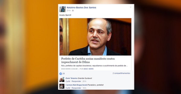 O presidente do PT de Curitiba, Natalino Bastos, comemorou nesta quarta (13), a posição do prefeito de Curitiba Gustavo Fruet (PDT) a favor da presidente Dilma e contra o impeachment. Em um post no facebook, Natalino compartilhou notícia do site do petista Enio Verri que mostra que Fruet assinou um manifesto de prefeitos contra o impeachment de Dilma. “Muito bem”, disse o presidente do PT acompanhado por militantes petistas que também saudaram a posição de Fruet.