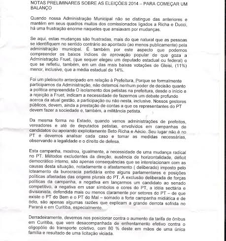 Com base no documento de uma corrente se defende que o partido se posicione contra o aumento das passagens, além de fazer critica a condução da gestão de Fruet(PDT), responsabilizando-o pela baixa votação de Dilma Rouseff(PT) e Gleisi Hoffmann(PT).
