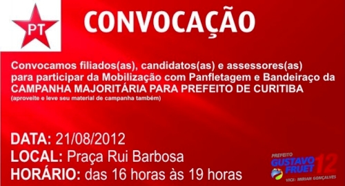 Pois, pois, ainda com certa resistência ao nome de Gustavo Fruet, o PT nativo decidiu entrar na campanha com um bandeiraço ruidoso e emblemático da tomada de Curitiba, como dizem os seus mais entusiasmados militantes. O bandeiraço da campanha será hoje na Praça Rui Barbosa. A moçada fiel ao partido concluiu que é melhor ganhar com Fruet e ocupar a prefeitura do que perder todas as chances. Até os assessores foram chamados.