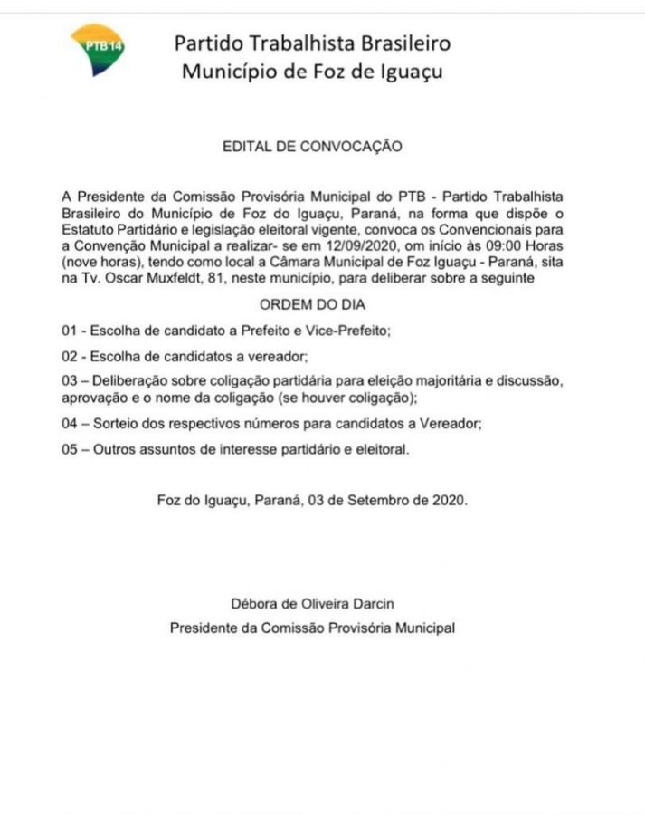 A presidente do PTB de Foz do Iguaçu, Debora de Oliveira Darcin, convocou a convenção municipal do partido para este sábado, 12, a partir das 9h, na Câmara de Vereadores. O PTB vai seguir todos os protocolos de segurança sanitária, entre eles, o uso de máscara facial e higiene das mãos com álcool em gel.