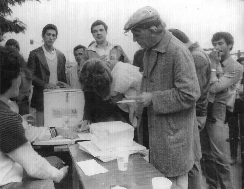 Tempos idos no início da década de 80. As eleições para prefeito em Foz do Iguaçu estavam suspensas pela Lei de Segurança Nacional. A oposição fez então uma eleição simulada na Fartal – a festa era na Avenida JK – e não deu outra. O popular e folclórico Quati – um marinheiro que veio parar nos costados do rio Paraná, venceu a consulta. Na foto, o popular Gaúcho sufragava seu voto na urna.