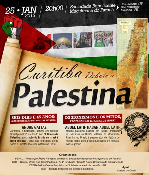 A Questão Palestina será tema de um debate no próximo dia 25 de janeiro (sexta-feira), no auditório da Sociedade Beneficente Muçulmana do Paraná, na Rua Kellers, 476, no bairro São Francisco em Curitiba. O evento, a partir das 20h, terá palestra do jornalista e historiador André Gattaz e do médico Abdel Latif Hasan Abdel Latif.