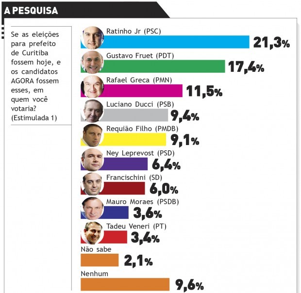 Levantamento da IRG Consultoria & Pesquisa feito com exclusividade para o Portal Bem Paraná aponta o deputado Ratinho Junior (PSC) a frente do prefeito Gustavo Fruet (PDT). Ratinho tem 21,3% contra 17,4% de Fruet. Como a margem de erro é de 2,6 pontos porcentuais para mais ou para menos, os dois estariam tecnicamente empatados.