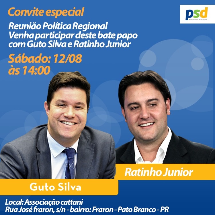 O secretário de Desenvolvimento Urbano, Ratinho Junior, e o deputado Guto Silva reúnem lideranças e moradores da região de Pato Branco neste sábado, a partir das 14h, na Associação Cattani. O convite é do PSD que propõe a discussão de novas ideias e novos projetos para o Paraná.
