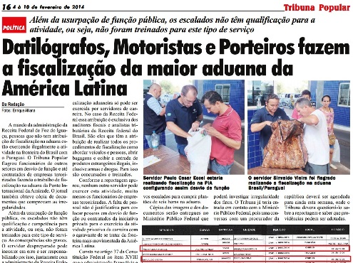 Reportagem do jornal Tribuna Popular, de Foz do Iguaçu, flagrou motoristas, porteiros e datilógrafos fazendo a fiscalização na maior aduana da América Latina, na Ponte da Amizade, na fronteira Brasil e Paraguai. O jornal investigou denúncias e constatou que funcionários de outros setores em desvio de função e até contratados de empresas terceirizadas fazem o trabalho de fiscalização na aduana. O jornal afirmou ainda ter obtido cópia de documentos que comprovam as irregularidades. A entrada de armas e drogas são a maior preocupação da matéria.