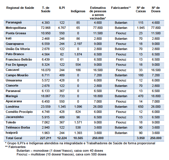 Abaixo a lista da quantidade de pessoas a serem imunizadas nas regiões do Paraná: