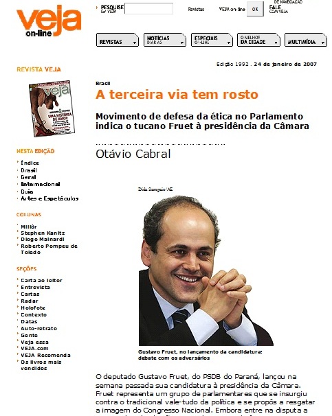 Cabral teceu uma série de loas a Fruet, indicava que o ex-tucano representava “um grupo de parlamentares que se insurgiu contra o tradicional vale-tudo da política e se propôs a resgatar a imagem do Congresso Nacional. Embora entre na disputa a poucos dias da eleição, marcada para 1º de fevereiro, o deputado acredita que pode mudar o atual quadro em que o candidato petista Arlindo Chinaglia desponta como favorito”.