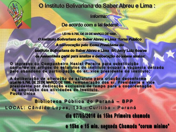 O presidente Jerry Luiz Soares convida para reunião do Instituto Bolivariano do Saber Abreu e Lima, a partir das 15h deste sábado (07) na Biblioteca Pública do Paraná (Avenida Cândido Lopes, 133 – centro de Curitiba). Na pauta da reunião o ingresso de Hasiel Pereira no Instituto e deliberação de alteração do estatuto da entidade.