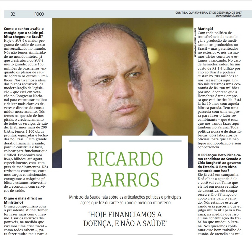 O meu compromisso com o presidente Michel Temer foi fazer mais com o mesmo. Usar os recursos disponíveis, na medida que vivemos uma crise fiscal – como todos sabem –, para fazer muito mais para a população. E temos conseguido. Claro, esbarramos em uma cultura de pessoal muito arraigada, então as pessoas que trabalham no sistema não querem mudar sua rotina, são resistentes. Nós estamos implantando biometria do funcionário e do usuário em todo o sistema, estamos colocando rastreadores em todas as ambulâncias. Estamos trabalhando para dar tablets para todos os Agentes Comunitários de Saúde, para lançar os dados em casa e termos uma informação segura. Conseguimos reduzir significativamente os custos dos medicamentos e com isso ampliamos o acesso.