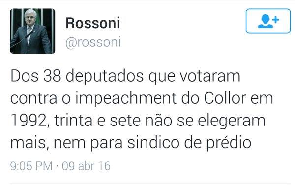 O deputado Valdir Rossoni (PSDB), chefe da Casa Civil, avisa no twitter que os deputados que votaram contra o impeachment de Fernando Collor em 1992 não se reelegeram nem para síndico. “Dos 38 deputados que votaram contra o impeachment do Collor em 1992, trinta e sete não se elegeram mais, nem para sindico de prédio”, diz Rossoni.