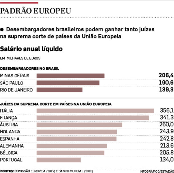 Esses valores superam os pagos a um juiz similar no Reino Unido, que recebe cerca de R$ 29 mil, e até dos Estados Unidos, cujo salário mensal médio é de R$ 43 mil. Chega a ser superior a juízes da Suprema Corte de países da União Europeia, como Bélgica e Portugal.
