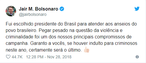 O presidente eleito Jair Bolsonaro (PSL) informou há pouco, em postagem no Twitter, que o indulto a presos no País, caso concedido, será o último. “Fui escolhido presidente do Brasil para atender aos anseios do povo brasileiro. Pegar pesado na questão da violência e criminalidade foi um dos nossos principais compromissos de campanha. Garanto a vocês, se houver indulto para criminosos neste ano, certamente será o último”, relatou Bolsonaro. Notícia Gustavo Porto, Estadão .