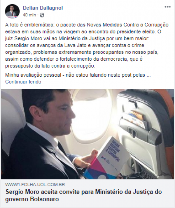 Deltan diz que Moro irá “consolidar avanços da Lava Jato” em ministério
