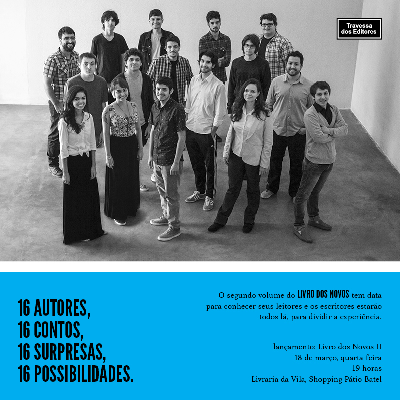É nesta quarta-feira, 18, às 19h na Livraria da Vila do Shopping Pátio Batel, em Curitiba, o lançamento da segunda edição do “Livro dos Novos” que traz contos inéditos de 16 jovens autores. A edição é da Travessa Editores. Nos contos é possível reconhecer pontos comuns entre 16 autores que não conversaram durante suas composições: certa desilusão por assuntos ordinários e importantes, uma esperança que vive no fio da navalha e a solidão de um mundo muito grande e muito cheio.