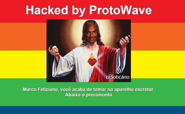 O site foi hackeado por “ProtoWave”, segundo a mensagem que aparece no superior da tela. Abaixo, lê-se “Feliciano, você acabou de tomar no aparelho excretor. Abaixo o preconceito”. O logotipo da loja de cosméticos “O Boticário”, que vem sendo criticada por incluir um “casal gay em sua propaganda de Dia dos Namorados”, está no canto inferior direito da imagem de Jesus, que tem em sua mão direta a cabeça de Feliciano e, na esquerda, um vidro de perfume.
