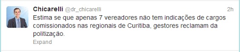 A politização nas regionais de Curitiba está provocando mal estar entre os gestores das unidades. Quem denuncia é o vereador Chicarelli. Segundo ele, apenas sete dos 38 vereadores da Casa não tem indicados nas regionais, agora comandadas pelo prefeito Gustavo Fruet (PDT).