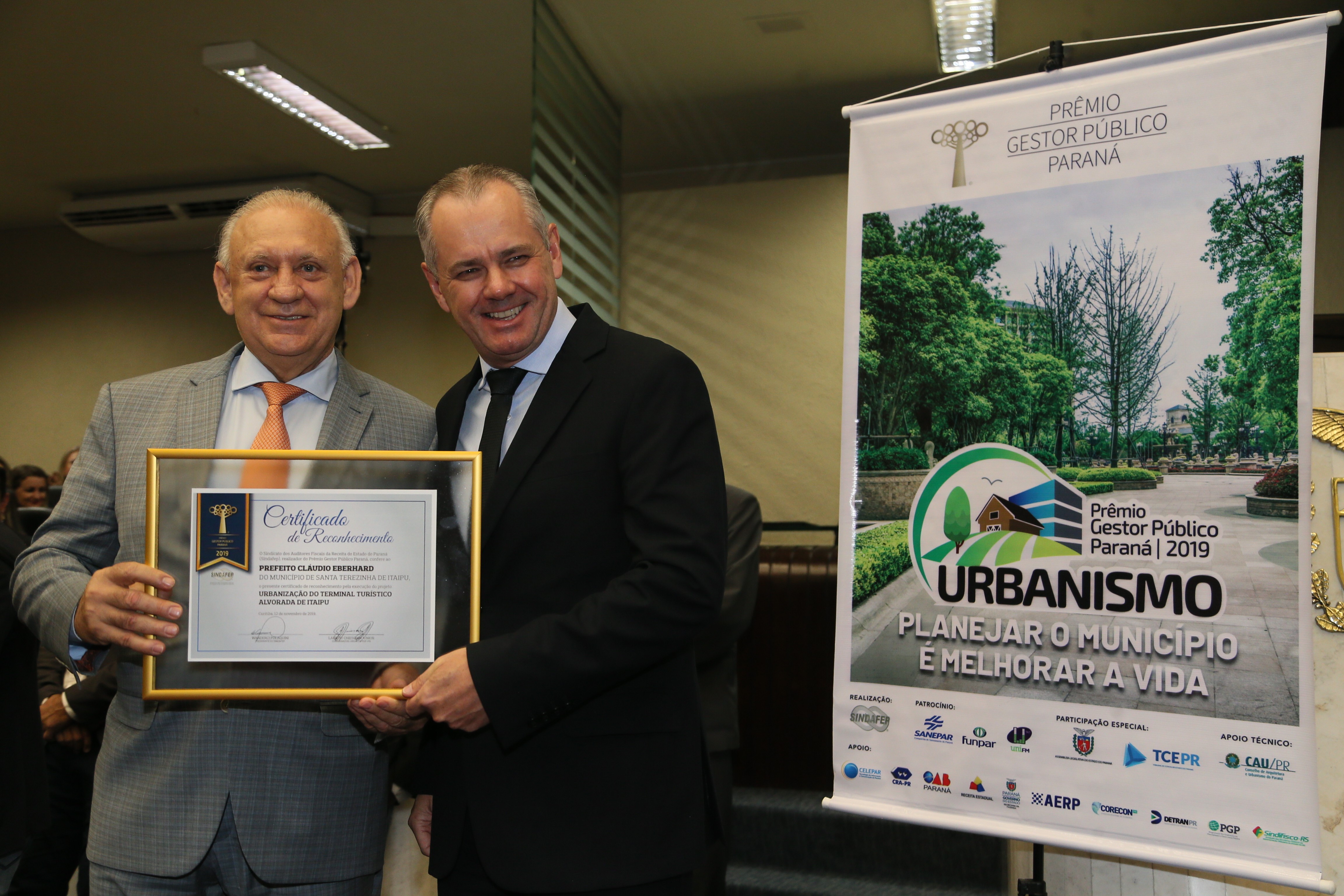 O prefeito Claudio Ebehard (PSDB) recebeu na noite desta terça-feira, 12, em Curitiba, dois prêmios de gestão pública de projetos desenvolvidos em Santa Terezinha de Itaipu. É o sexto ano consecutivo que a cidade é premiada pelo Sindicato dos Auditores Fiscais da Receia Estadual do Paraná. Receberam os prêmios, os projetos “Cultivando Saúde e Saberes” e “Urbanização do Terminal Turístico Alvorada de Itaipu”.