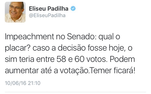 O ministro Eliseu Padilha (Casa Civil) adiantou o placar do impeachment de Dilma Rousseff (PT) no Senado e diz que o presidente Michel Temer (PMDB) ficará no comando do país. “Impeachment no Senado: qual o placar? caso a decisão fosse hoje, o sim teria entre 58 e 60 votos. Podem aumentar até a votação.Temer ficará!”, disse Padilha no twitter.