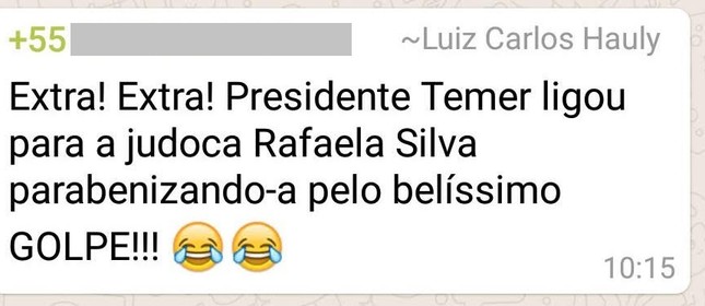 O tucano Luiz Carlos Hauly fez piada hoje com Michel Temer e Rafaela Silva, num grupo de WhatsApp de deputados. Disse Hauly: “Presidente Temer ligou para a judoca Rafaela Silva parabenizando-a pelo belíssimo golpe”.