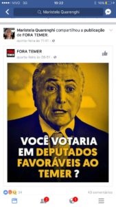 Esposa do senador Roberto Requião, que vive às turras com seu partido e até ameaçado de expulsão do PMDB, dona Maristela prega fidelidade absoluta. Deputados que votarem (ou votaram) a favor de Temer não mereceriam confiança. Seria um recado ao sobrinho deputado João Arruda que, na votação da Câmara que livrou Temer da degola, votou a favor do presidente? É o que a tia Maristela dá a entender com o recadinho ilustrado que postou nas redes sociais. As informações são do blog Contraponto.