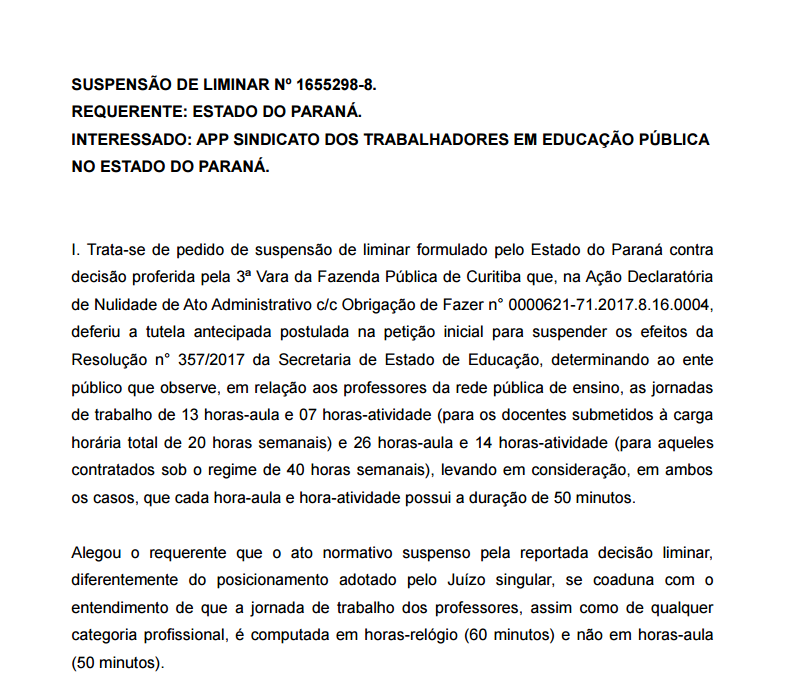 No despacho, a presidência do TJ-PR concluiu que, avaliando os argumentos do Estado do Paraná, as decisões proferidas anteriormente poderiam causar grave lesão à ordem e economia públicas. Portanto, concedeu a suspensão da liminar, mantendo os critérios de hora-atividade realizados pelo Governo do Estado.