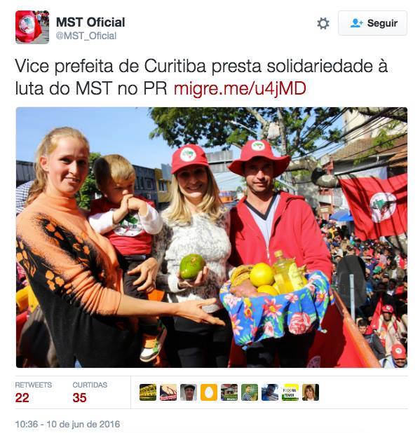 Enquanto o prefeito Gustavo Fruet (PDT) não sabe o que fazer com o MST que invadiu Curitiba, bloqueia ruas, ocupa a prefeitura e prédios do Incra e INSS, a vice-prefeita, Mirian Gonçalves (PT) dá total apoio ao movimento dos sem terra. Mirian já visitou o acampamento do MST na rua Dr Fraive, levou cestas básicas e ainda ofereceu apoio jurídico em caso de qualquer problema com a Justiça.