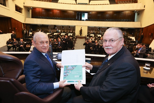 Nesta quarta-feira, 16, na Assembleia Legislativa, o diretor Administrativo do BRDE, Orlando Pessuti, ao lado de funcionários, recebeu do presidente da Casa, deputado Ademar Traiano, um certificado e aproveitou para contar um pouco da história dos 55 anos do banco e apresentar os principais resultados da instituição nos últimos anos. O BRDE tem 35 mil clientes, em praticamente 90% dos municípios do Sul do País, perto de 600 colaboradores e R$ 15 bilhões em ativos.