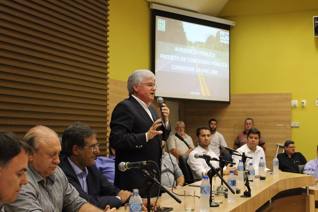 O chefe da Casa Civil, Valdir Rossoni, conduziu nesta quarta-feira (7), em Pato Branco, no Sudoeste do Paraná, audiência pública para tratar do processo de concessão da PRC-280. A equipe do governo do Estado apresentou um estudo técnico e esclareceu dúvidas da comunidade a respeito do projeto, que prevê diversas intervenções ao longo de 285 quilômetros da estrada, entre Realeza e General Carneiro.