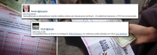 Detalhe: pelas regras do Exame Nacional do Ensino Médio, os alunos não poderiam levar nem câmeras fotográficas nem celulares aos locais das provas. E quem fosse flagrado tentando capturar alguma imagem seria imediatamente desclassificado, como ocorreu com dezenas de estudantes. Depois desse tweet infeliz, as fotos no Instagram não foram postadas no site de Veja.com.