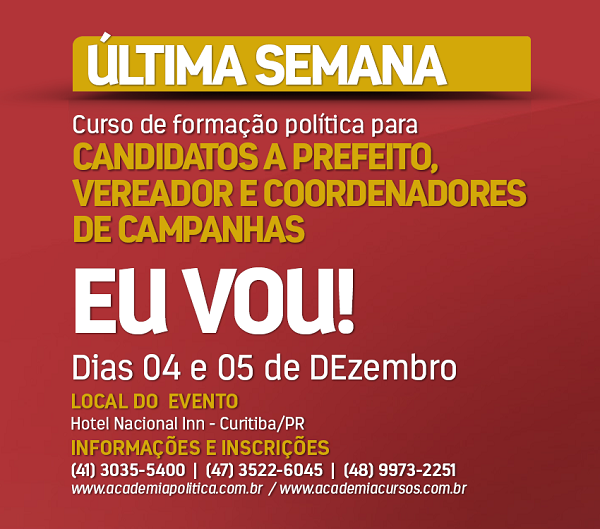 Ainda dá tempo de participar da capacitação para candidatos a prefeito, vice e vereador no pleito de outubro do ano que vem. Entre em contato agora no telefone (41) 9286-7600, com Tadeu Comerlatto.