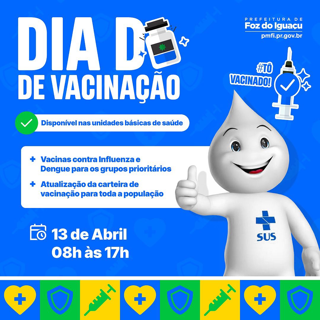 Acontece neste sábado (13), o Dia “D” de Mobilização Nacional contra a Influenza, com a abertura de todas as 29 Unidades Básicas de Saúde de Foz do Iguaçu, das 8h às 17 horas. Neste dia, também estará disponível a vacinação contra a dengue para crianças e adolescentes de 10 a 14 anos e as demais vacinas do calendário nacional para a população em geral.