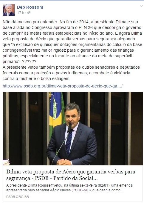 “Não dá mesmo pra entender. No fim de 2014, a presidente Dilma e sua base aliada no Congresso aprovaram o PLN 36 que desobriga o governo de cumprir as metas fiscais estabelecidas no início do ano. E agora Dilma veta proposta de Aécio que garantia verbas para segurança alegando que “a exclusão de quaisquer dotações orçamentárias do cálculo da base contingenciável traz maior rigidez para o gerenciamento das finanças públicas, especialmente no tocante ao alcance da meta de superávit primário”. A presidente vetou também propostas de outros senadores e deputados federais como a proteção a povos indígenas, o combate à violência contra a mulher e o bolsa estiagem”, disse Rossoni.