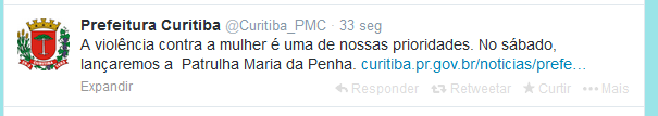 Em ato falho, a prefeitura de Curitiba diz em sua conta oficial no Twitter que “a violência contra a mulher é uma de nossas prioridades”, diz o post que completa: “No sábado, lançaremos a Patrulha Maria da Penha”. É ou não é de chorar?
