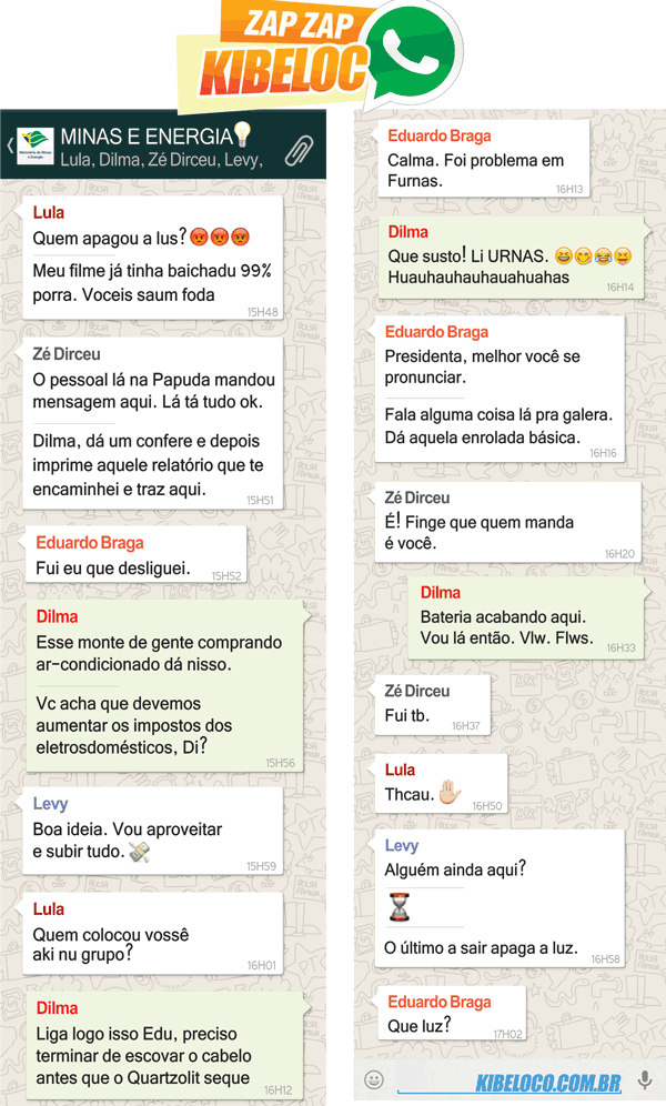 WhatsApp da galera da Dilma 25/01/2015 E o apagão, em várias áreas, por que passa o governo Dilma já virou piada na internet. Compartilhe isso: Clique para compartilhar no Facebook(abre em nova janela) Facebook Clique para compartilhar no X(abre em nova janela) 18+ Clique para compartilhar no WhatsApp(abre em nova janela) WhatsApp Relacionado